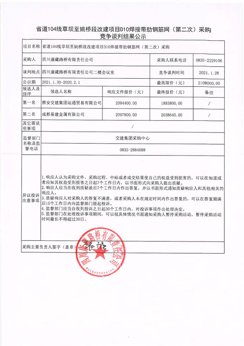 四川康藏路橋有限責任公司省道104線草壩至姚橋段改建項目D10焊接帶肋鋼筋網(wǎng)(第二次)采購競爭談判結(jié)果公示