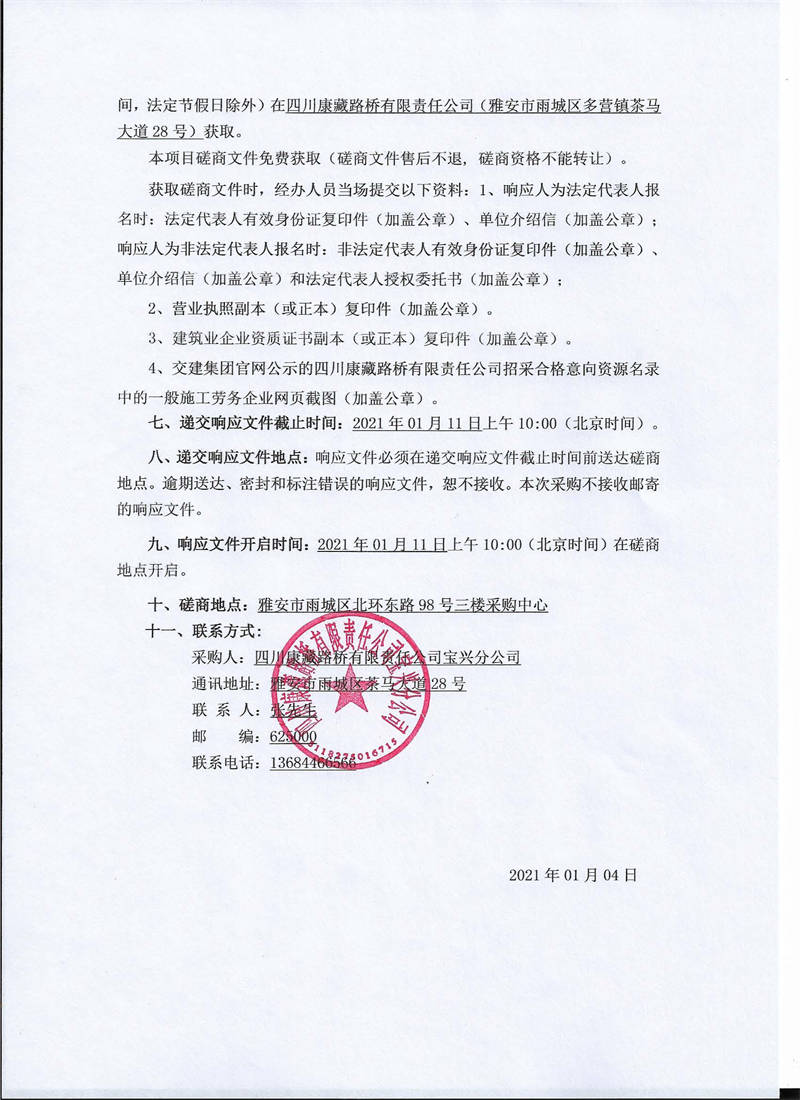 四川康藏路橋有限責任公司寶興分公司省道432線雅安段擴建工程K19新建拌合站施工勞務磋商公告