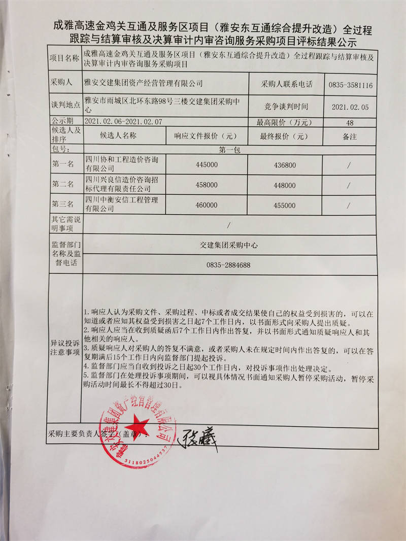 雅安交建集團(tuán)資產(chǎn)經(jīng)營管理有限公司成雅高速金雞關(guān)互通及服務(wù)區(qū)項(xiàng)目(雅安東互通綜合提升改造)全過程跟蹤與結(jié)算審核及決算審計內(nèi)審咨詢服務(wù)評標(biāo)結(jié)果公示