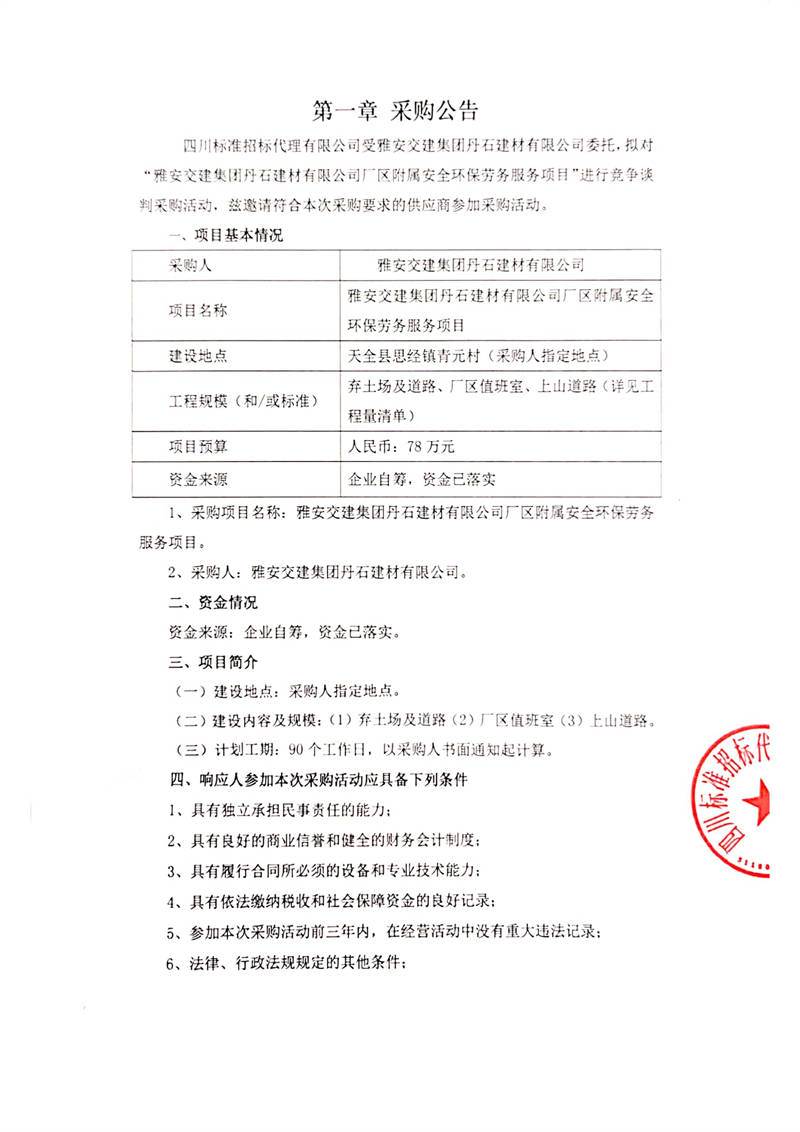 雅安交建集團(tuán)丹石建材有限公司廠區(qū)附屬安全環(huán)保勞務(wù)服務(wù)項(xiàng)目競爭談判公告