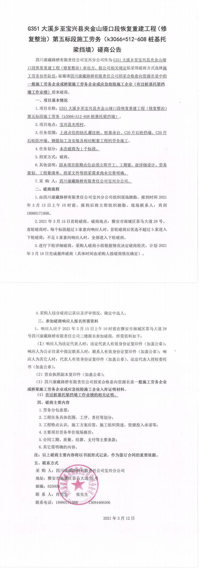 四川康藏路橋有限責(zé)任公司寶興分公司G351大溪鄉(xiāng)至寶興縣夾金山埡口段恢復(fù)重建工程(修復(fù)整治)第五標(biāo)段施工勞務(wù)(k3066+512-608樁基托梁擋墻)磋商公告