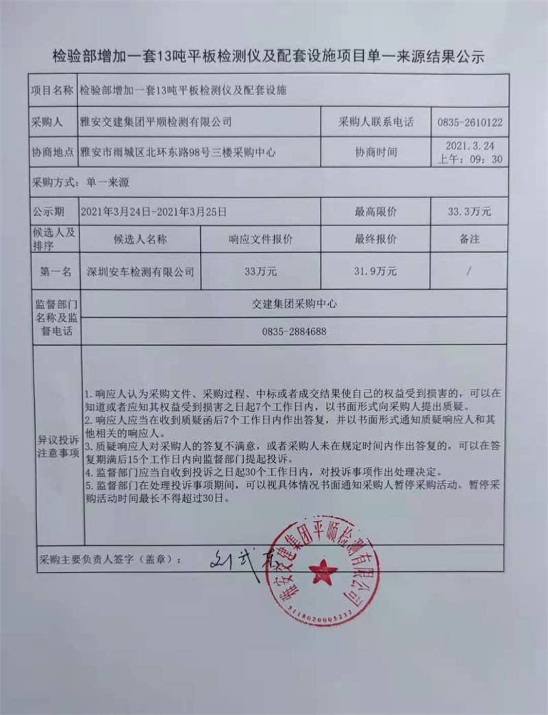 雅安交建集團平順檢測有限公司檢驗部增加一套13噸平板檢測儀及配套設施項目單一來源結果公示