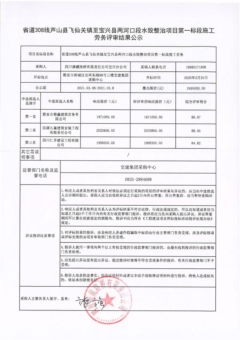 四川康藏路橋有限責(zé)任公司寶興分公司省道308線蘆山縣飛仙關(guān)鎮(zhèn)至寶興縣兩河口段水毀整治項(xiàng)目第一標(biāo)段施工勞務(wù)評(píng)審結(jié)果公示