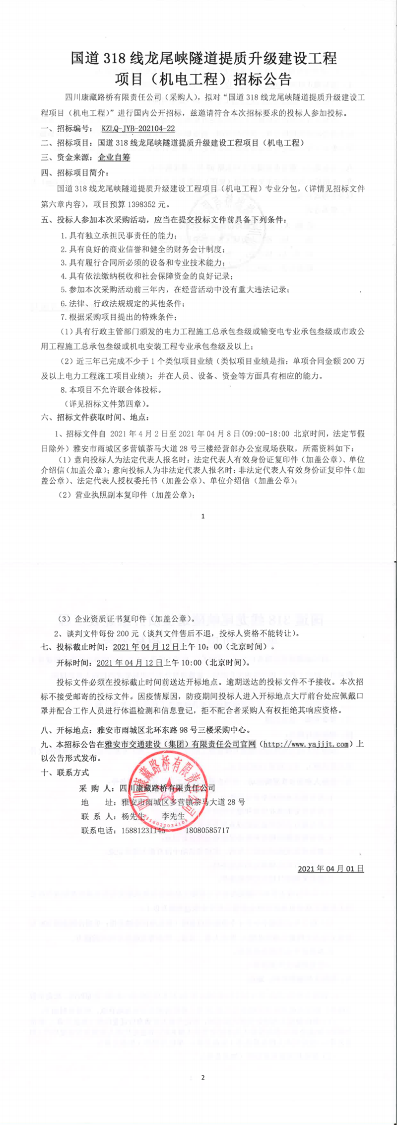 四川康藏路橋有限責(zé)任公司國道318線龍尾峽隧道提質(zhì)升級建設(shè)工程項目(機電工程)招標(biāo)公告