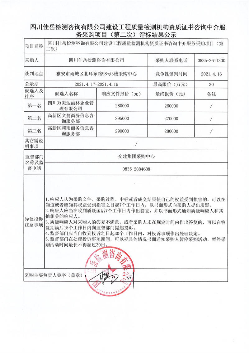四川佳岳檢測(cè)咨詢有限公司建設(shè)工程質(zhì)量檢測(cè)機(jī)構(gòu)資質(zhì)證書(shū)咨詢中介服務(wù)采購(gòu)項(xiàng)目(第二次)評(píng)標(biāo)結(jié)果公示