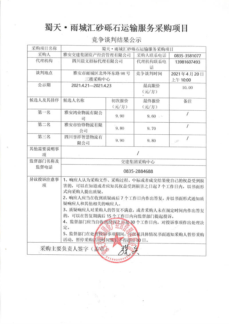雅安交建集團(tuán)資產(chǎn)經(jīng)營(yíng)管理有限公司蜀天.雨城匯砂礫石運(yùn)輸服務(wù)采購(gòu)項(xiàng)目競(jìng)爭(zhēng)談判結(jié)果公示