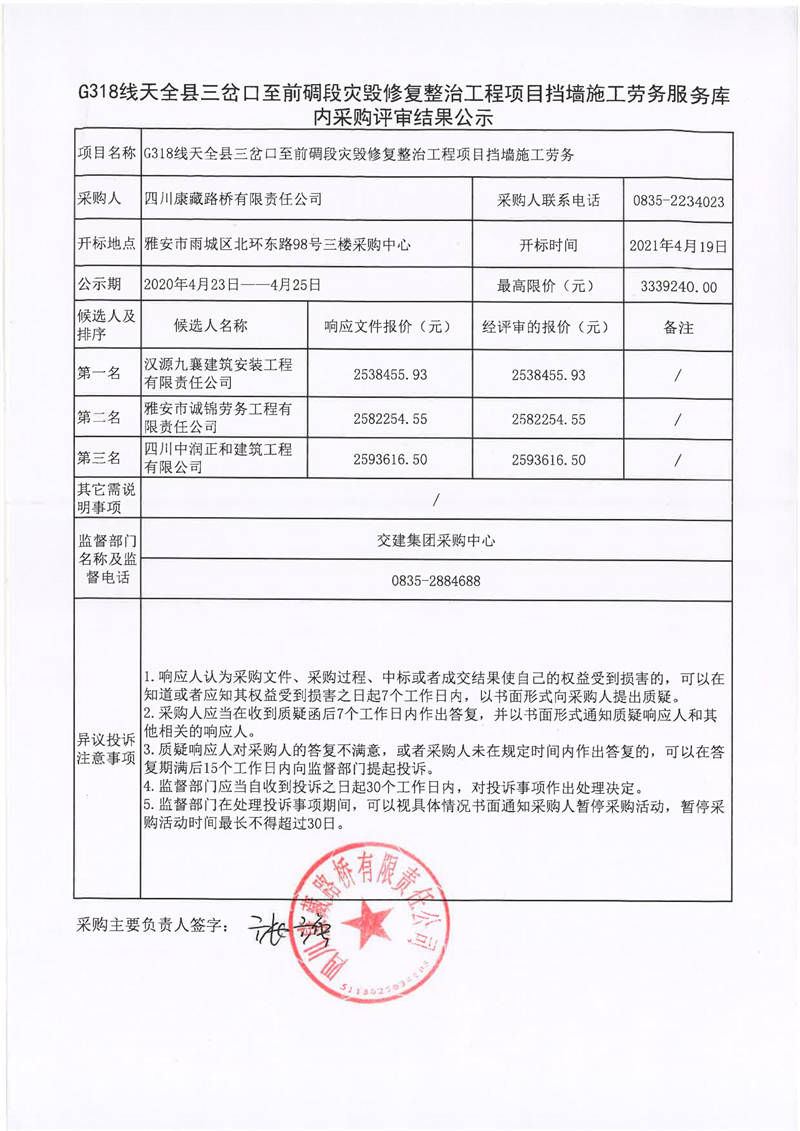 四川康藏路橋有限責(zé)任公司G318線天全縣三岔口至前碉段災(zāi)毀修復(fù)整治工程項(xiàng)目擋墻施工勞務(wù)服務(wù)庫內(nèi)采購評(píng)審結(jié)果公示