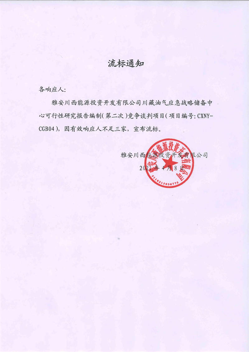 雅安川西能源投資開發(fā)有限公司川藏油氣應(yīng)急戰(zhàn)略儲備中心可行性研究報告編制(第二次)競爭談判項目流標通知