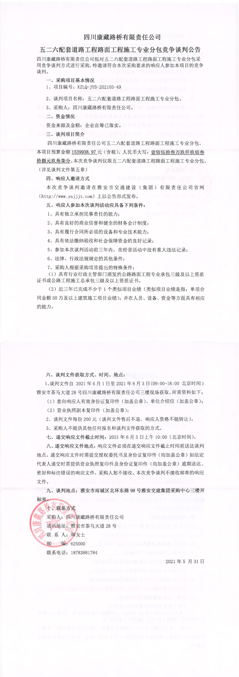 四川康藏路橋有限責(zé)任公司五二六配套道路工程路面工程施工專業(yè)分包競(jìng)爭(zhēng)談判公告