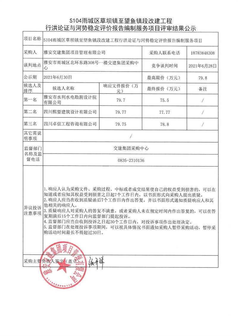 雅安交建集團項目管理有限公司S104雨城區(qū)草壩鎮(zhèn)至望魚鎮(zhèn)段改建工程行洪論證與河勢穩(wěn)定評價報告編制服務(wù)項目評審結(jié)果公示