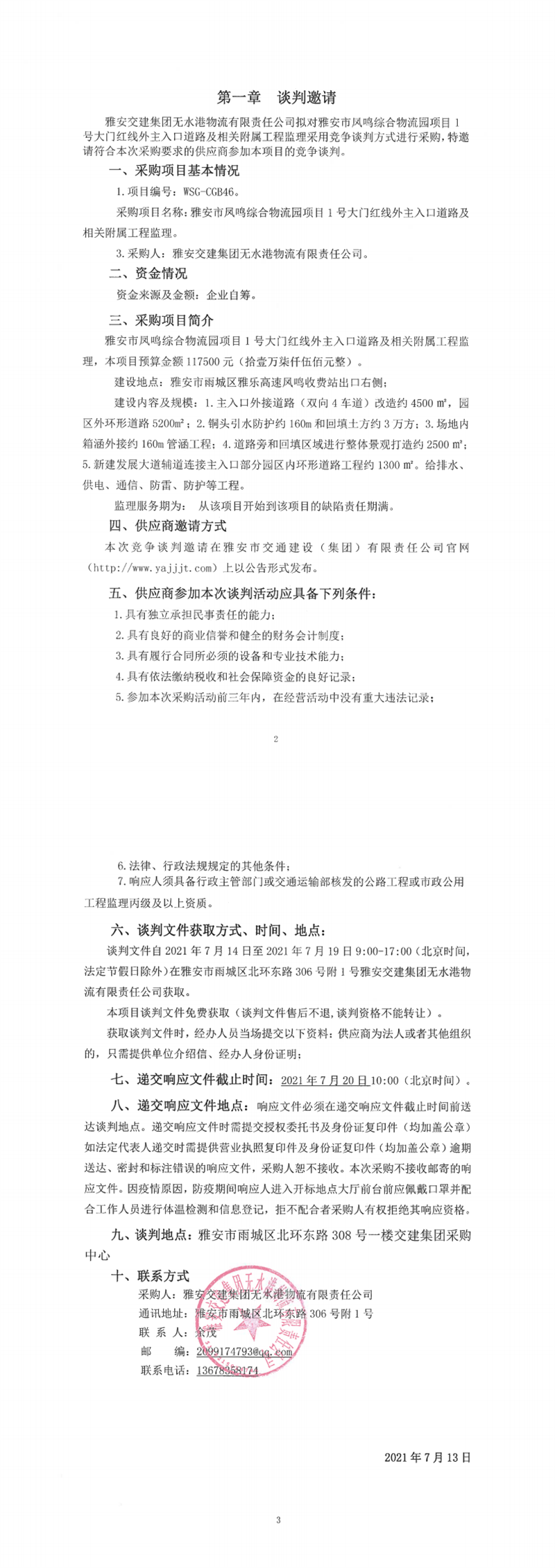 雅安交建集團(tuán)無(wú)水港物流有限責(zé)任公司雅安市鳳鳴綜合物流園項(xiàng)目1號(hào)大門(mén)紅線外主入口道路及相關(guān)附屬工程監(jiān)理競(jìng)爭(zhēng)談判公告