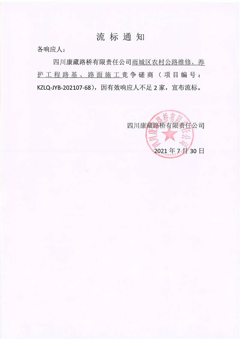 四川康藏路橋有限責(zé)任公司雨城區(qū)農(nóng)村公路維修、養(yǎng)護工程路基、路面施工競爭磋商流標(biāo)通知
