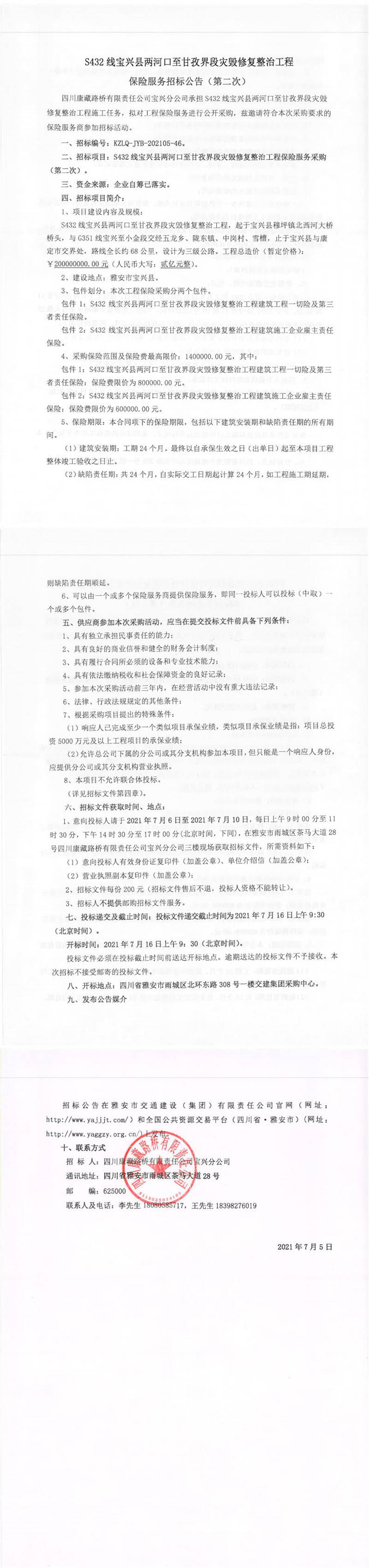 四川康藏路橋有限責(zé)任公司S432線寶興縣兩河口至甘孜界段災(zāi)毀修復(fù)整治工程保險(xiǎn)服務(wù)招標(biāo)公告(第二次)