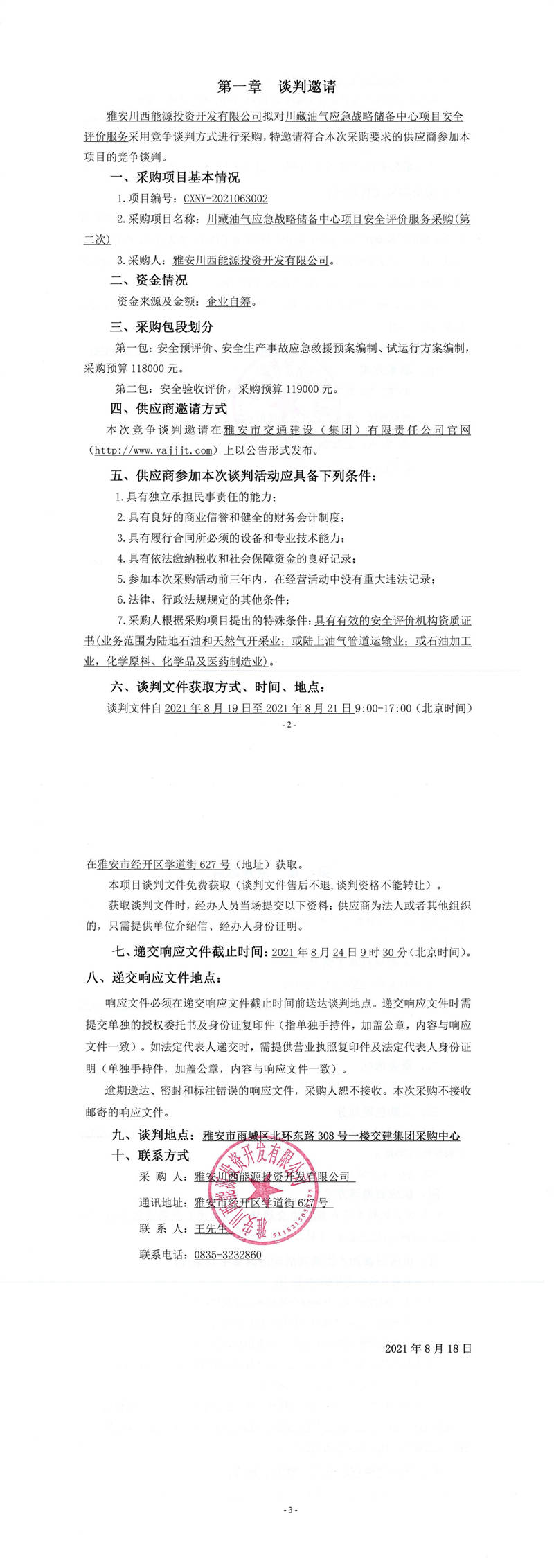 雅安川西能源投資開(kāi)發(fā)有限公司川藏油氣應(yīng)急戰(zhàn)略儲(chǔ)備中心項(xiàng)目安全評(píng)價(jià)服務(wù)采購(gòu)(第二次)競(jìng)爭(zhēng)談判公告