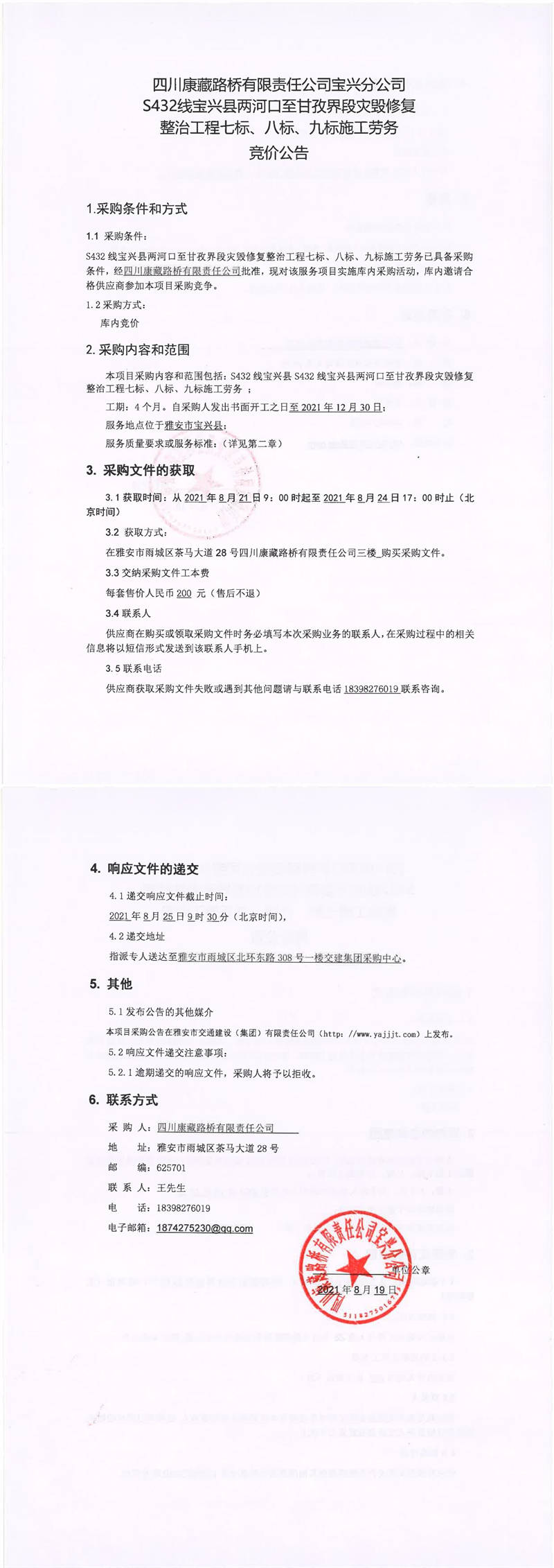 四川康藏路橋有限責(zé)任公司寶興分公司S432線寶興縣兩河口至甘孜界段災(zāi)毀修復(fù)整治工程七標(biāo)、八標(biāo)、九標(biāo)施工勞務(wù)競價(jià)公告