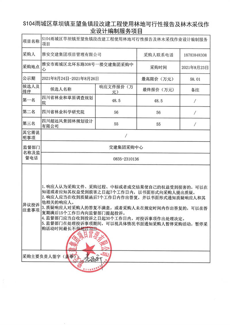 雅安交建集團(tuán)項(xiàng)目管理有限公司S104雨城區(qū)草壩鎮(zhèn)至望魚鎮(zhèn)段改建工程使用林地可行性報(bào)告及林木采伐作業(yè)設(shè)計(jì)編制服務(wù)項(xiàng)目評(píng)審結(jié)果公示