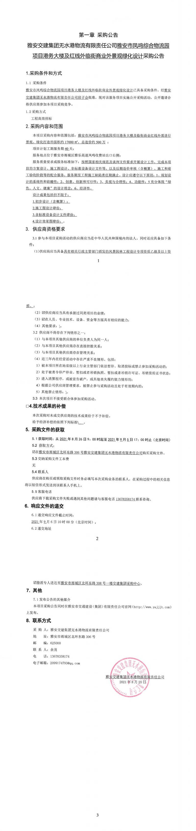 雅安交建集團無水港物流有限責任公司雅安市鳳鳴綜合物流園項目港務(wù)大樓及紅線外臨街商業(yè)外景觀綠化設(shè)計采購公告