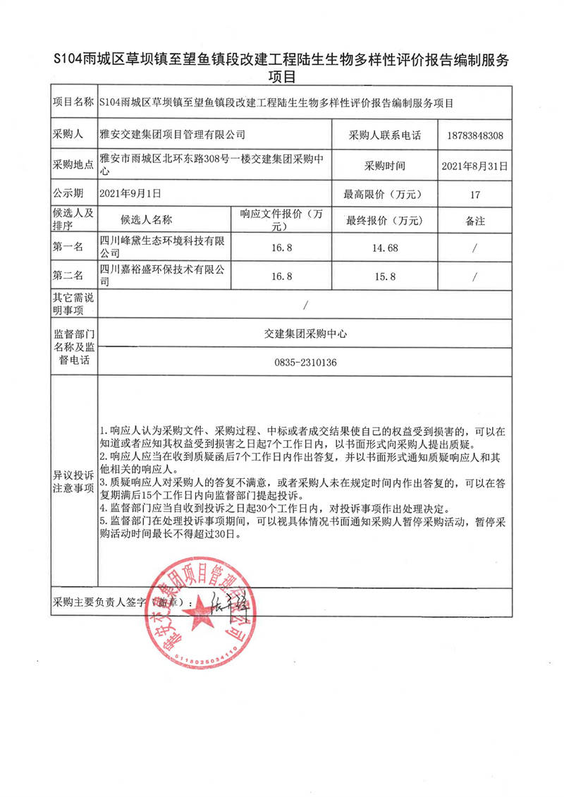 雅安交建集團項目管理有限公司S104雨城區(qū)草壩鎮(zhèn)至望魚鎮(zhèn)段改建工程陸生生物多樣性評價報告編制服務項目評審結(jié)果公示