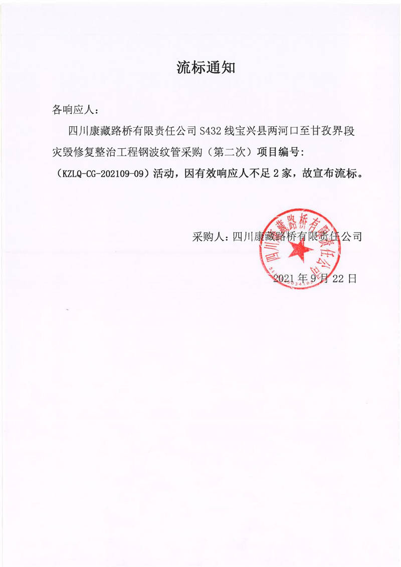 四川康藏路橋有限責(zé)任公司S432線寶興縣兩河口至甘孜界段災(zāi)毀修復(fù)整治工程鋼波紋管采購(第二次)流標通知