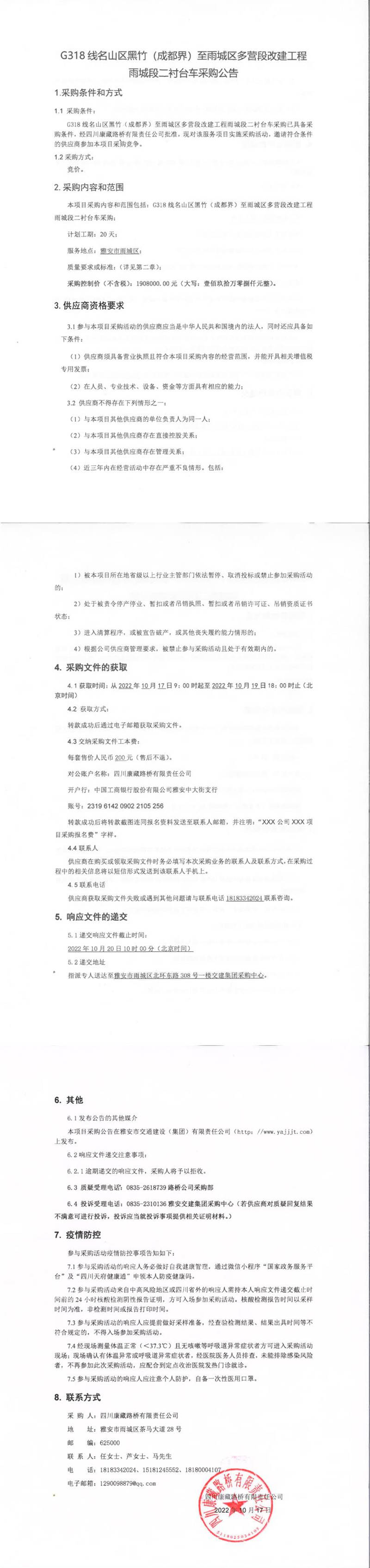 四川康藏路橋有限責任公司G318線名山區(qū)黑竹(成都界)至雨城區(qū)多營段改建工程雨城段二襯臺車采購公告