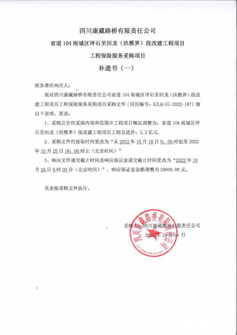 四川康藏路橋有限責任公司省道104雨城區(qū)坪石至回龍(洪雅界)段改建工程項目工程保險服務采購項目補遺書(一)