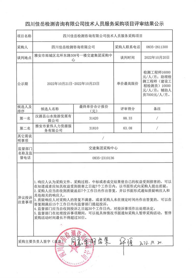 四川佳岳檢測咨詢有限公司技術(shù)人員服務(wù)采購項目評審結(jié)果公示
