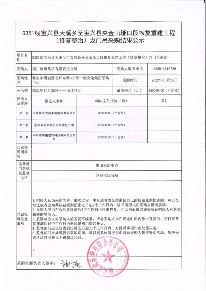 四川康藏路橋有限責(zé)任公司G351線(xiàn)寶興縣大溪鄉(xiāng)至寶興縣夾金山埡口段恢復(fù)重建工程(修復(fù)整治)龍門(mén)吊采購(gòu)結(jié)果公示