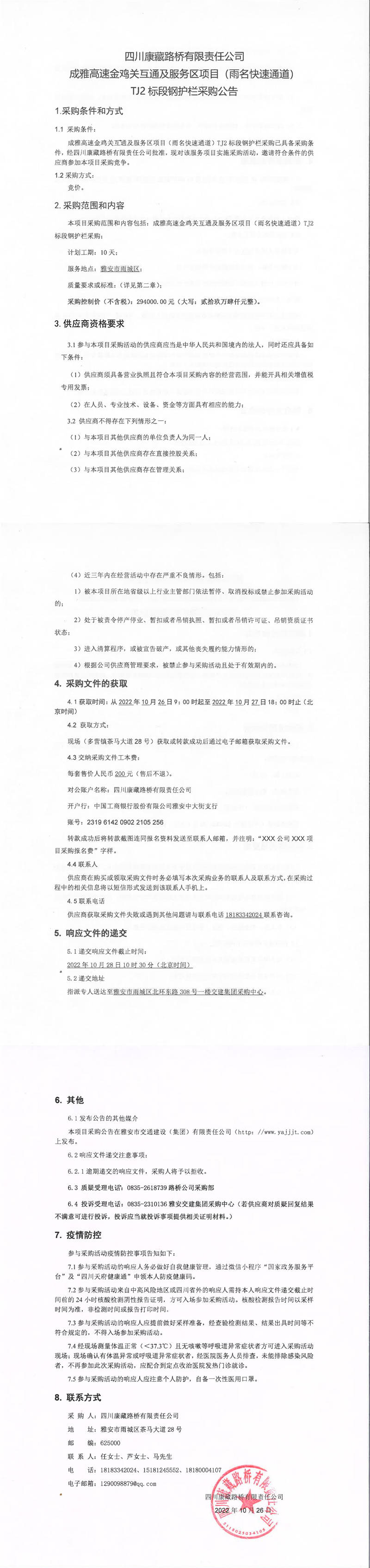 四川康藏路橋有限責任公司成雅高速金雞關(guān)互通及服務(wù)區(qū)項目(雨名快速通道)TJ2標段鋼護欄采購公告