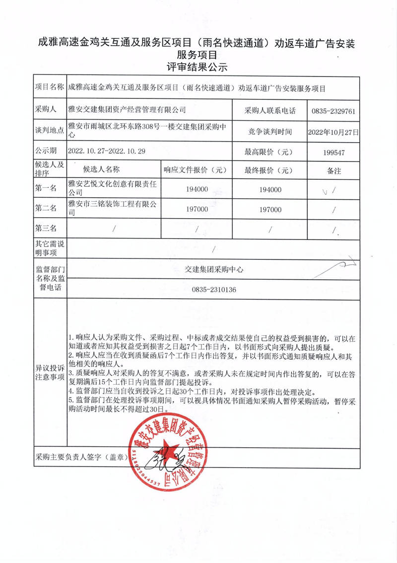 雅安交建集團資產(chǎn)經(jīng)營管理有限公司成雅高速金雞關互通及服務區(qū)項目(雨名快速通道)勸返車道廣告安裝服務項目評審結(jié)果公示