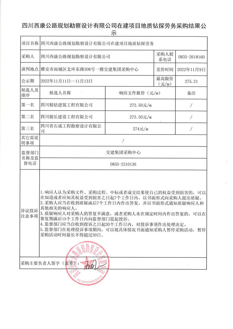 四川西康公路規(guī)劃勘察設(shè)計(jì)有限公司在建項(xiàng)目地質(zhì)鉆探勞務(wù)采購結(jié)果公示