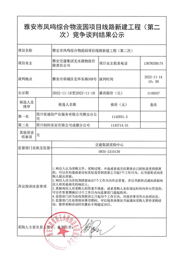 雅安交建集團(tuán)無水港物流有限責(zé)任公司雅安市鳳鳴綜合物流園項(xiàng)目線路新建工程(第二次)競爭談判結(jié)果公示