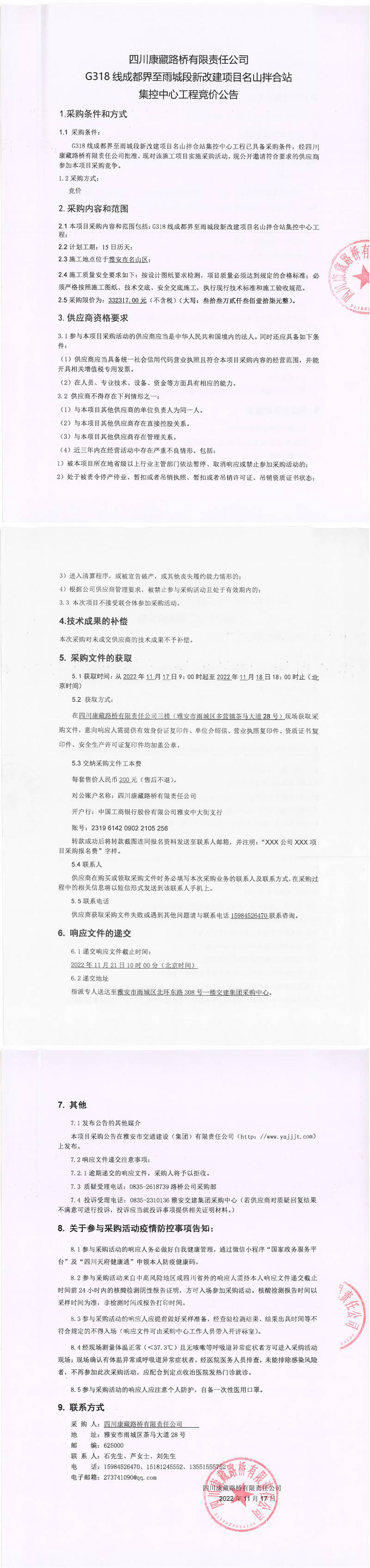 四川康藏路橋有限責任公司G318線成都界至雨城段新改建項目名山拌合站集控中心工程競價公告