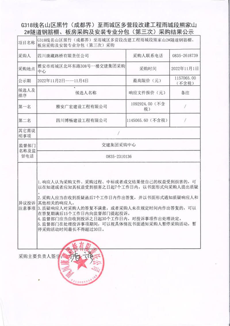 四川康藏路橋有限責(zé)任公司G318線名山區(qū)黑竹(成都界)至雨城區(qū)多營(yíng)段改建工程雨城段熊家山2#隧道鋼筋棚、板房采購(gòu)及安裝專(zhuān)業(yè)分包(第三次)采購(gòu)結(jié)果公示