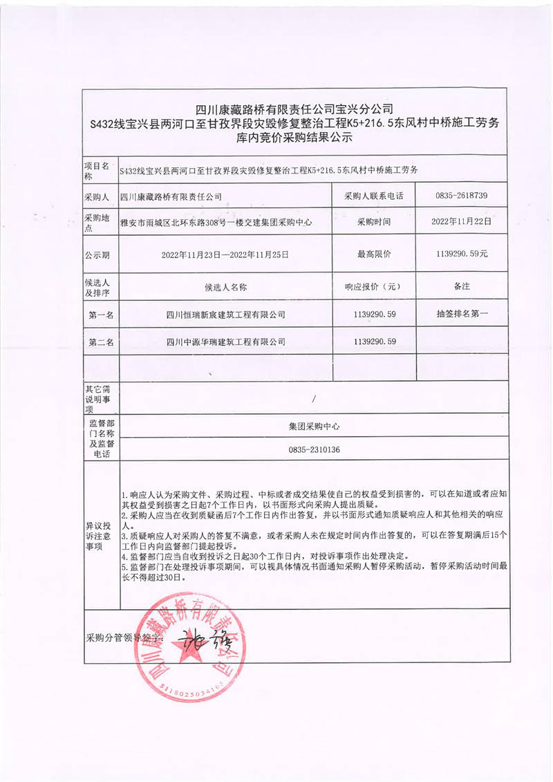 四川康藏路橋有限責(zé)任公司寶興分公司S432線寶興縣兩河口至甘孜界段災(zāi)毀修復(fù)整治工程K5+216.5東風(fēng)村中橋施工勞務(wù)庫內(nèi)競價采購結(jié)果公示