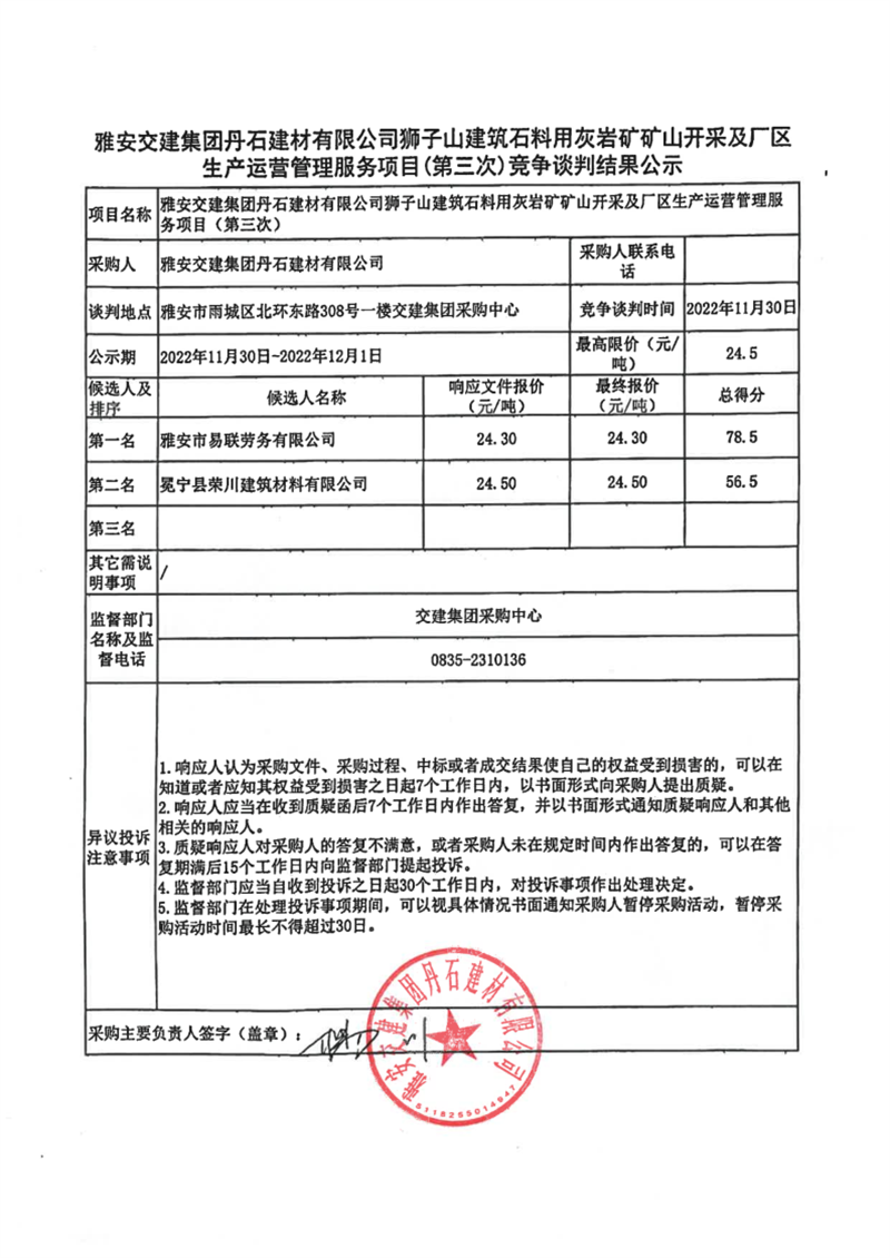 雅安交建集團(tuán)丹石建材有限公司獅子山建筑石料用灰?guī)r礦礦山開采及廠區(qū)生產(chǎn)運營管理服務(wù)項目(第三次)競爭談判結(jié)果公示