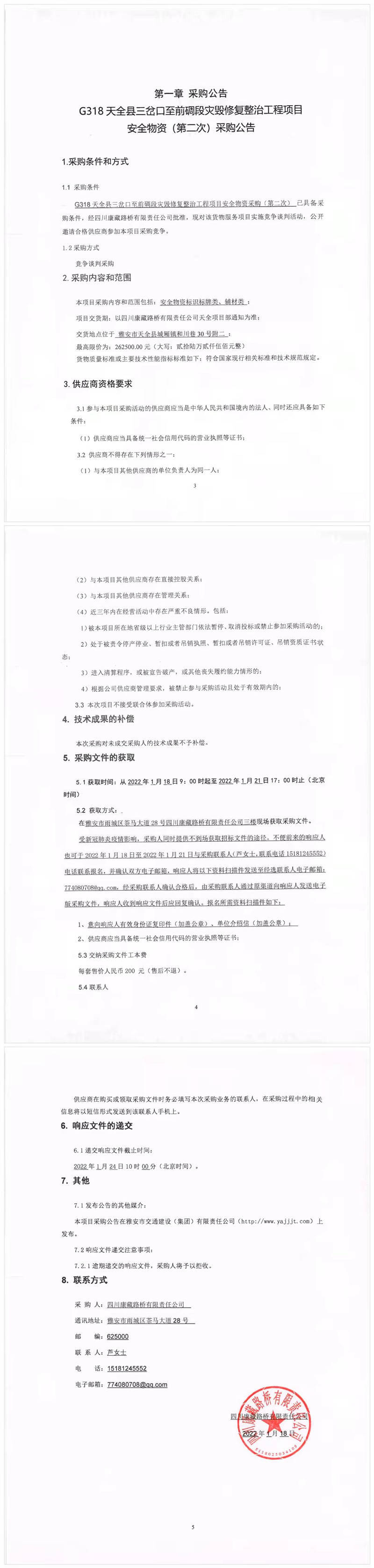 四川康藏路橋有限責(zé)任公司G318天全縣三岔口至前碉段災(zāi)毀修復(fù)整治工程項(xiàng)目安全物資(第二次)采購(gòu)公告