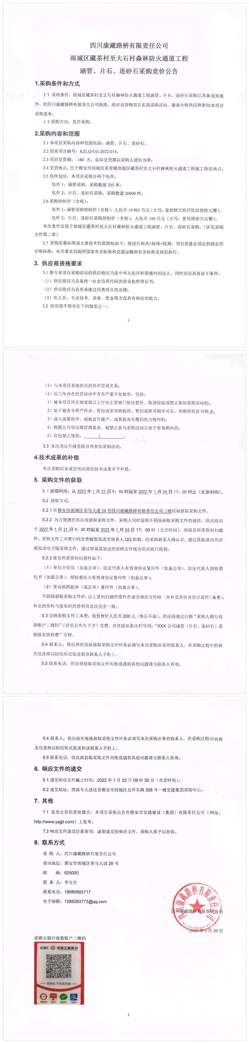 四川康藏路橋有限責(zé)任公司雨城區(qū)藏茶村至大石村森林防火通道工程涵管、片石、連砂石采購競價公告