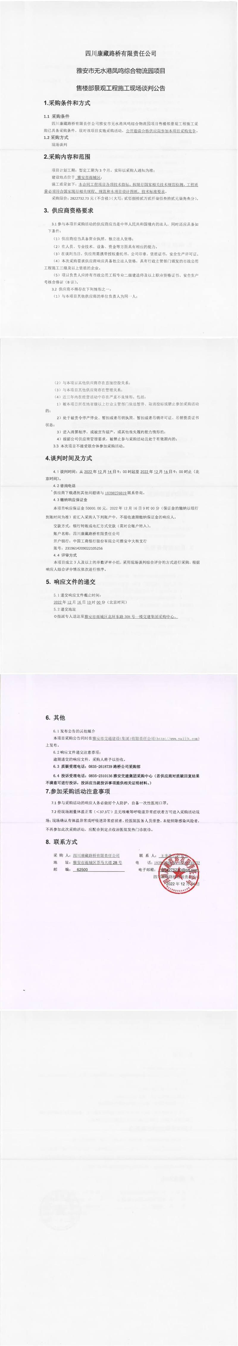 四川康藏路橋有限責(zé)任公司雅安市無(wú)水港鳳鳴綜合物流園項(xiàng)目售樓部景觀工程施工現(xiàn)場(chǎng)談判公告