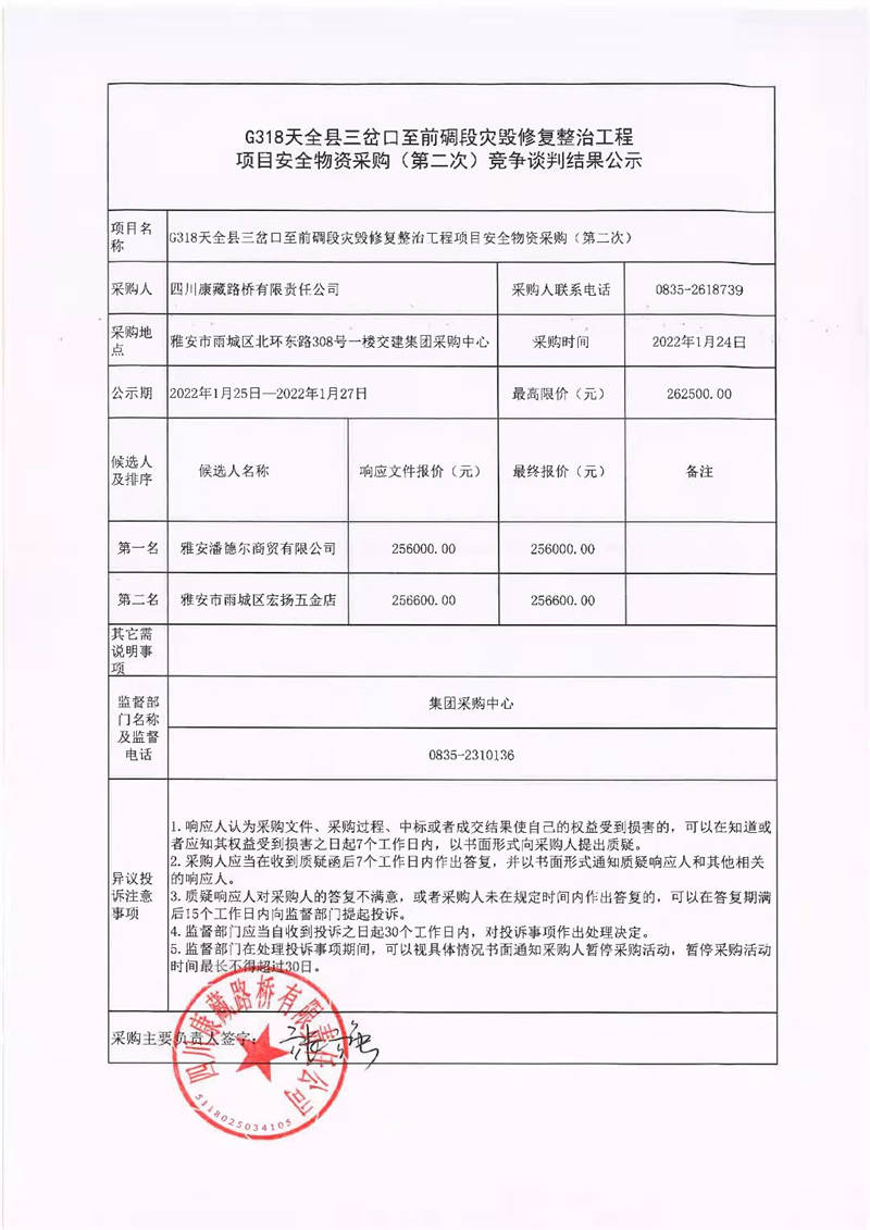 四川康藏路橋有限責(zé)任公司G318天全縣三岔口至前碉段災(zāi)毀修復(fù)整治工程項(xiàng)目安全物資采購(gòu)(第二次)競(jìng)爭(zhēng)談判結(jié)果公示
