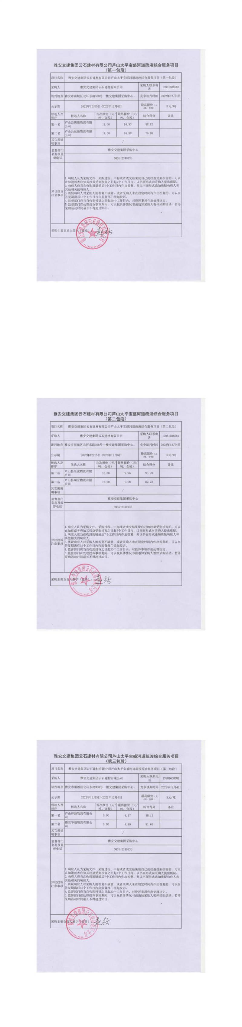 雅安交建集團(tuán)云石建材有限公司蘆山太平寶盛河道疏浚綜合服務(wù)項目(第一包段、第二包段、第三包段)結(jié)果公示