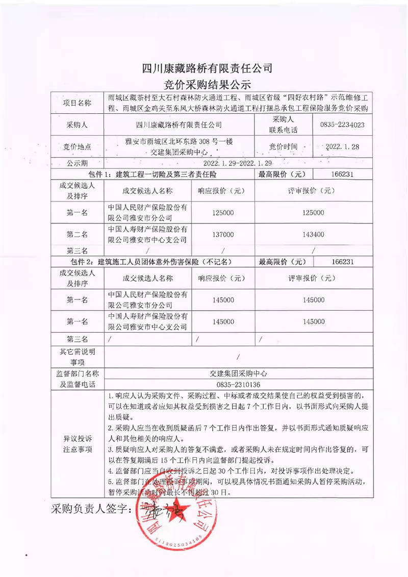 四川康藏路橋有限責(zé)任公司雨城區(qū)藏茶村至大石村森林防火通道工程、雨城區(qū)省級(jí)“四好農(nóng)村路”示范維修工程、雨城區(qū)金雞關(guān)至東風(fēng)大橋森林防火通道工程打捆總承包工程保險(xiǎn)服務(wù)競(jìng)價(jià)采購(gòu)結(jié)果公示