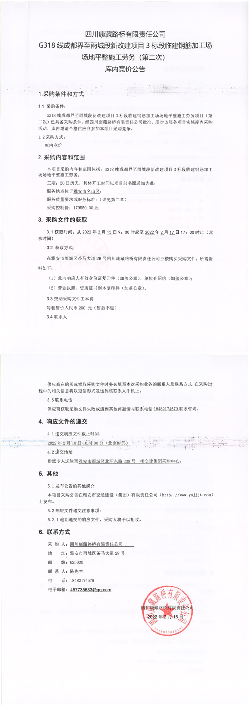 四川康藏路橋有限責(zé)任公司G318線成都界至雨城段新改建項目3標(biāo)段臨建鋼筋加工場場地平整施工勞務(wù)(第二次)庫內(nèi)競價公告
