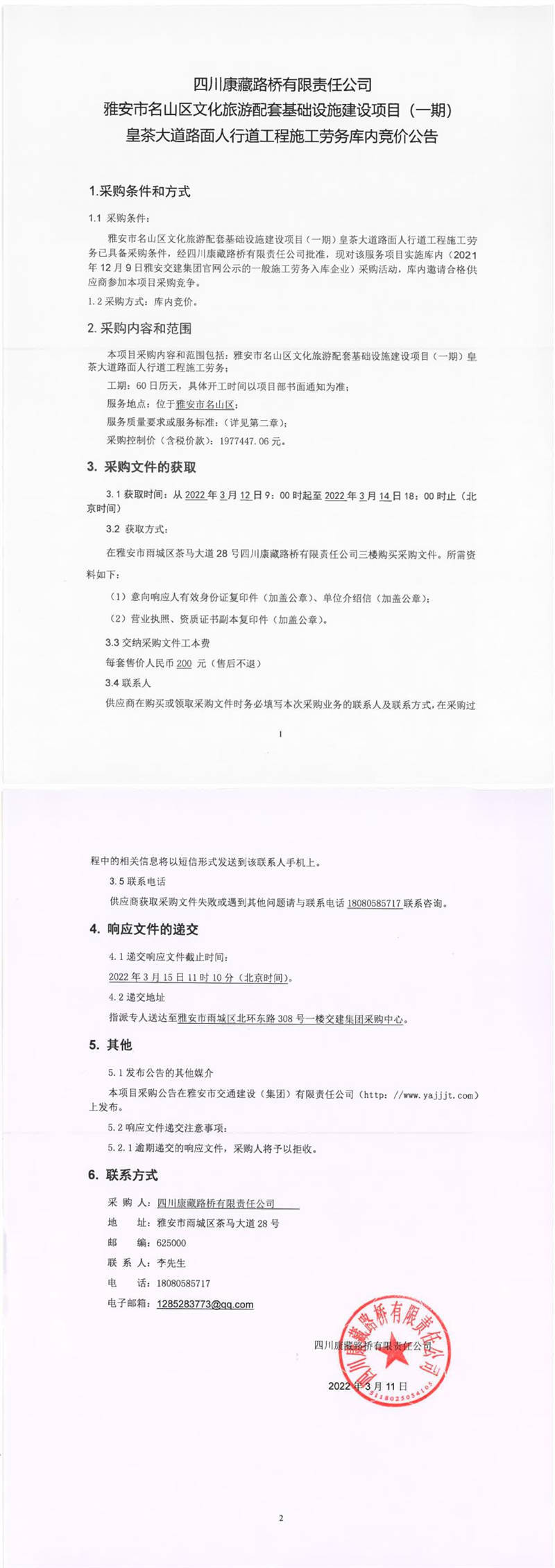 四川康藏路橋有限責(zé)任公司雅安市名山區(qū)文化旅游配套基礎(chǔ)設(shè)施建設(shè)項(xiàng)目(一期)皇茶大道路面人行道工程施工勞務(wù)庫內(nèi)競(jìng)價(jià)公告