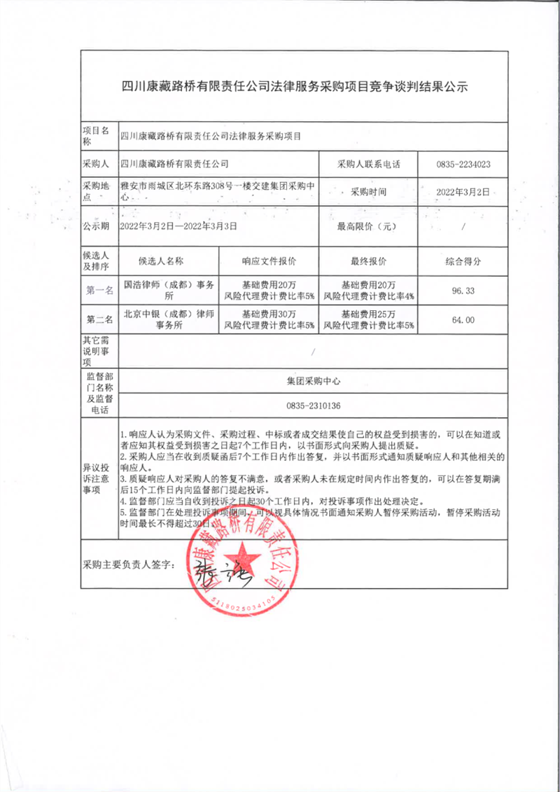 四川康藏路橋有限責任公司法律服務采購項目競爭談判結果公示
