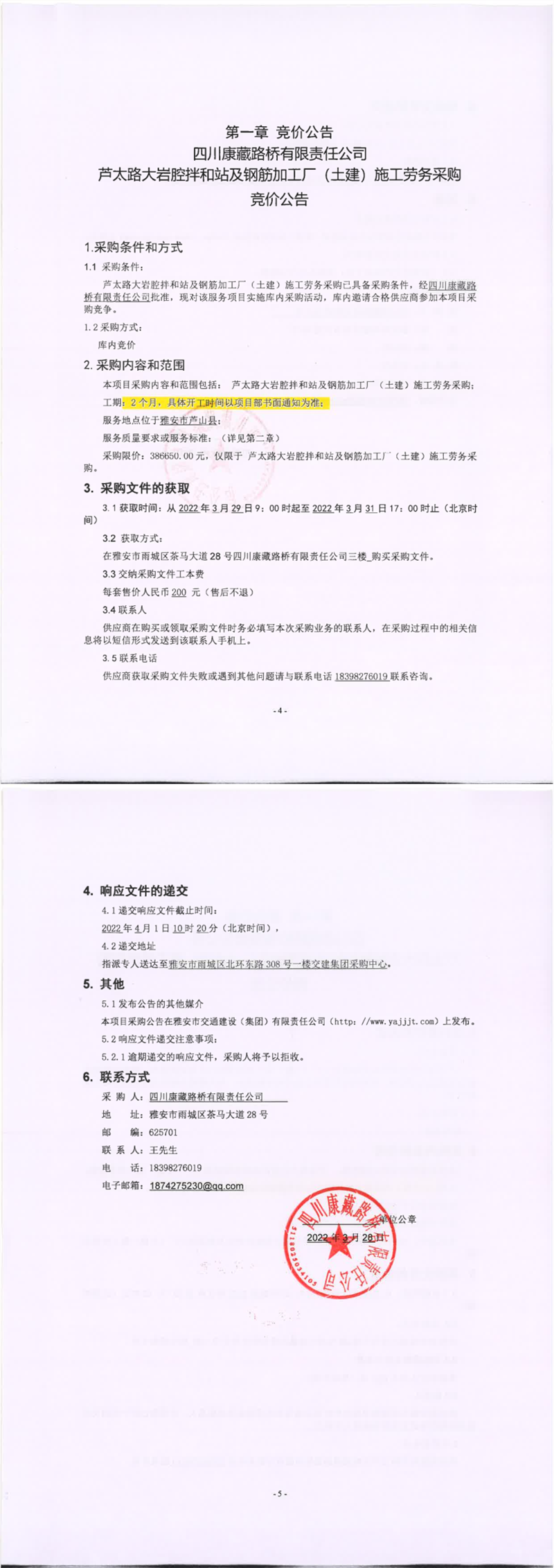 四川康藏路橋有限責(zé)任公司蘆太路大巖腔拌和站及鋼筋加工廠(土建)施工勞務(wù)采購(gòu)競(jìng)價(jià)公告