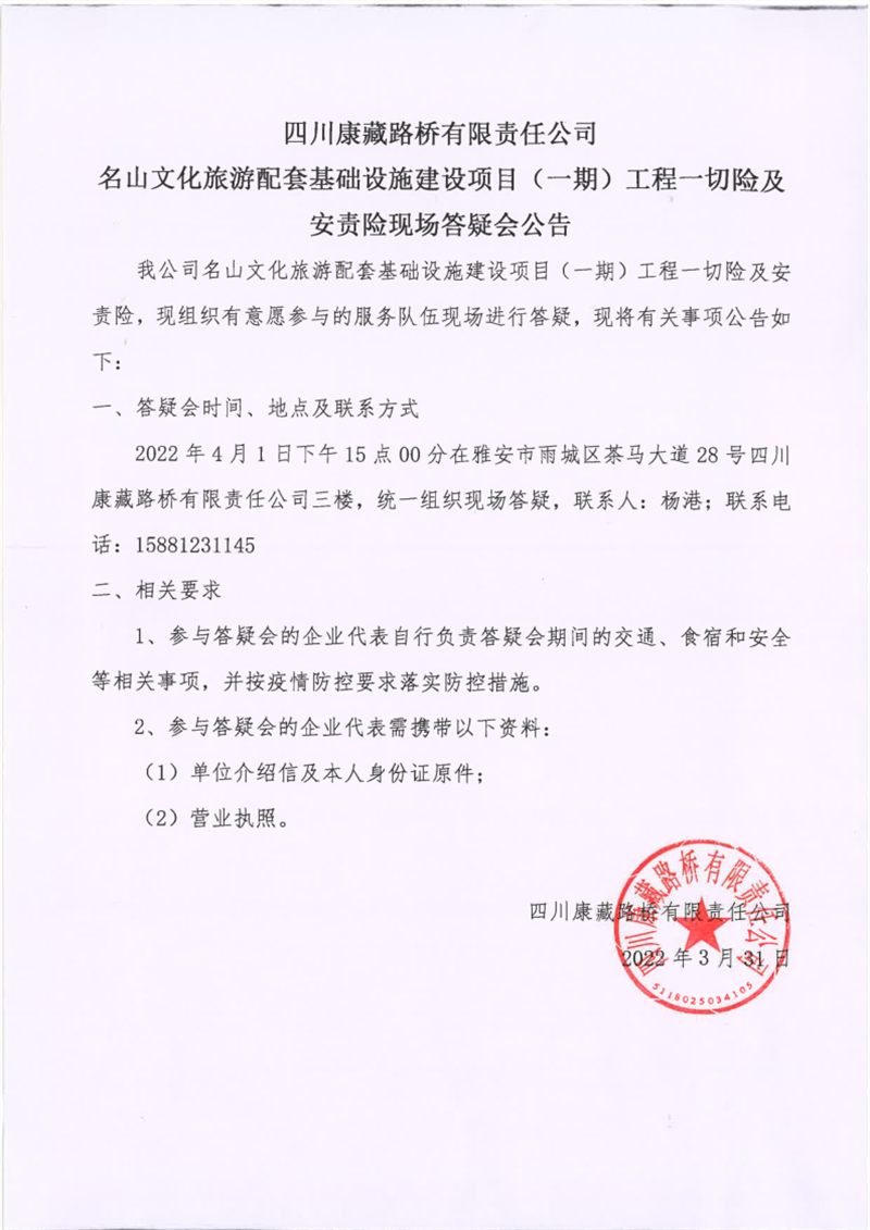四川康藏路橋有限責(zé)任公司名山文化旅游配套基礎(chǔ)設(shè)施建設(shè)項(xiàng)目(一期)工程一切險(xiǎn)及安責(zé)險(xiǎn)現(xiàn)場答疑會(huì)公告
