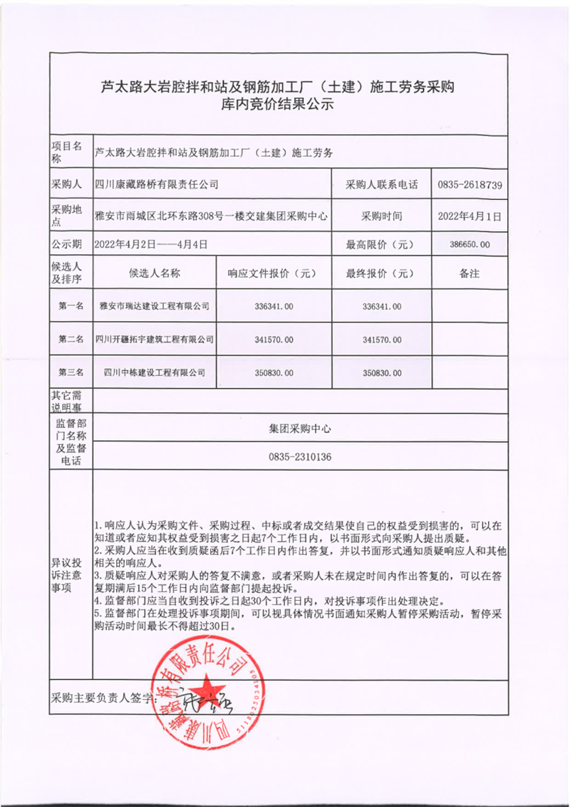 四川康藏路橋有限責任公司蘆太路大巖腔拌和站及鋼筋加工廠(土建)施工勞務采購庫內(nèi)競價結(jié)果公示