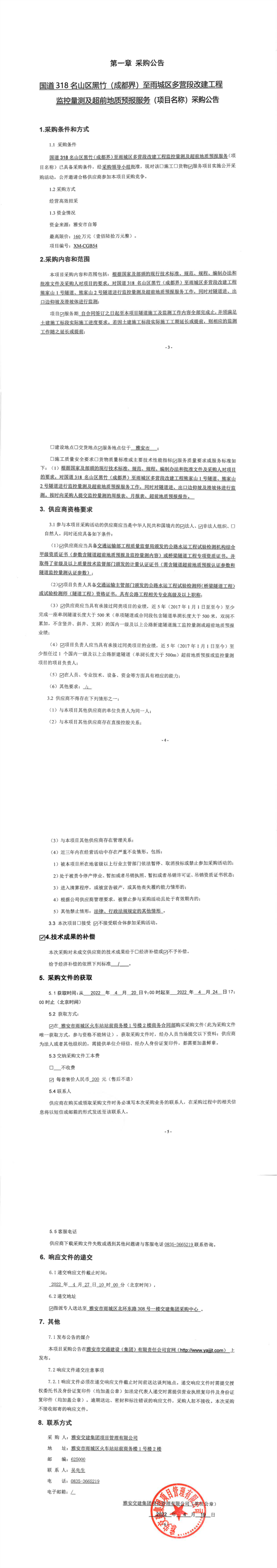 雅安交建集團項目管理有限公司國道318名山區(qū)黑竹(成都界)至雨城區(qū)多營段改建工程監(jiān)控量測及超前地質預報服務采購公告
