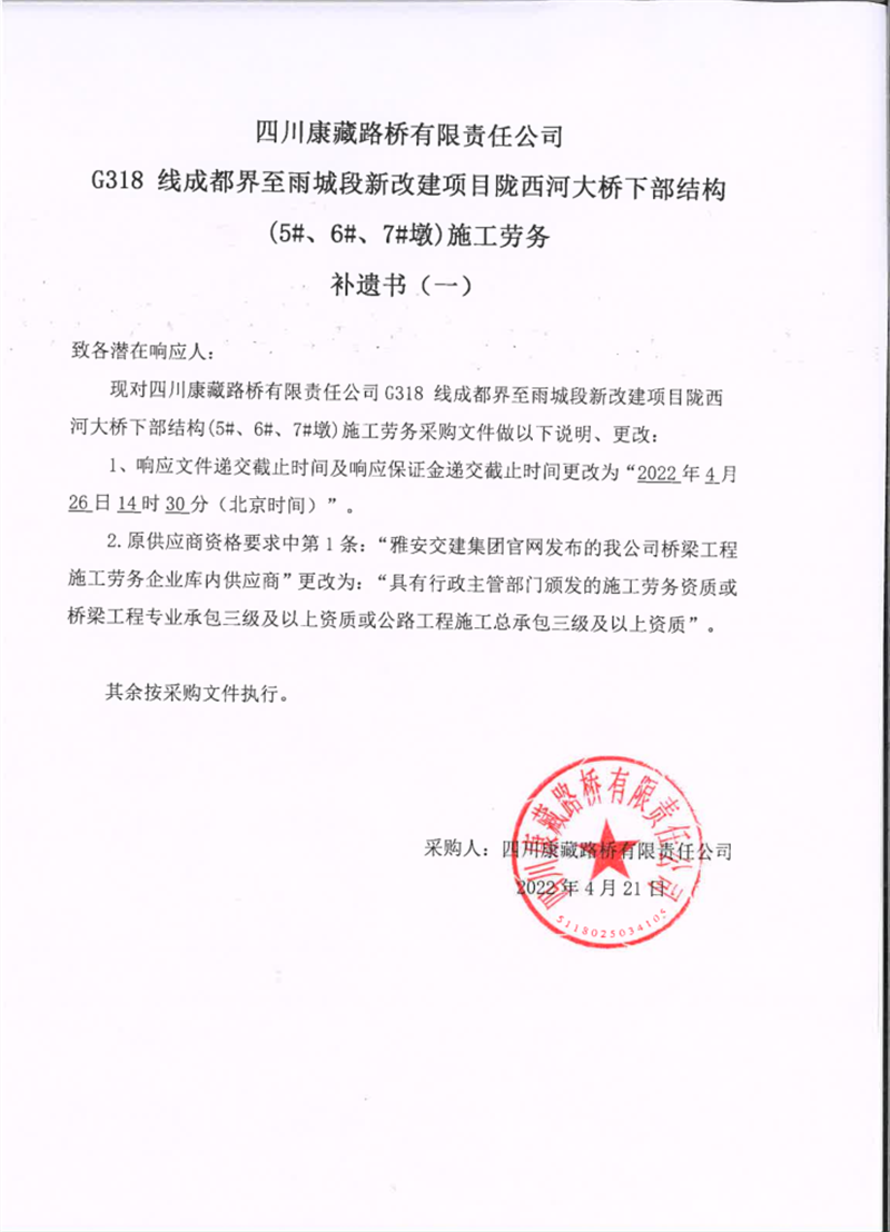 四川康藏路橋有限責任公司G318線成都界至雨城段新改建項目隴西河大橋下部結(jié)構(gòu)(5#、6#、7#墩)施工勞務補遺書(一)