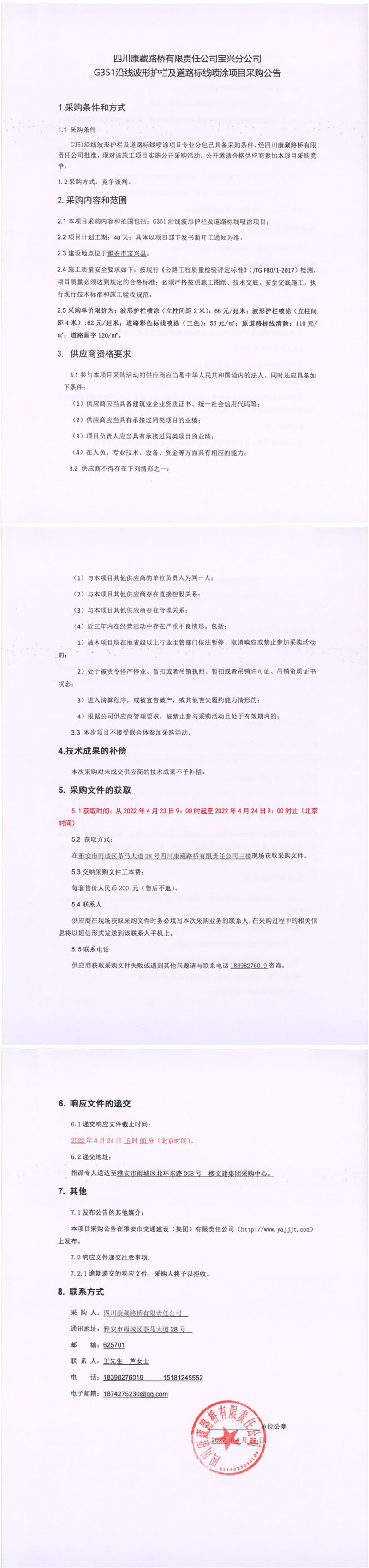 四川康藏路橋有限責(zé)任公司寶興分公司G351沿線波形護(hù)欄及道路標(biāo)線噴涂項(xiàng)目采購公告